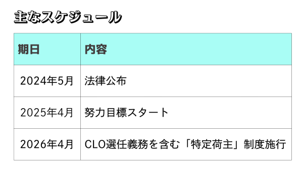 法律の公布は2024年5月に行われ、2025年時点では努力目標の段階にあるけど、2026年4月の施行に向けて社内外を巻き込んだ準備をしっかり進めておくことが重要や。