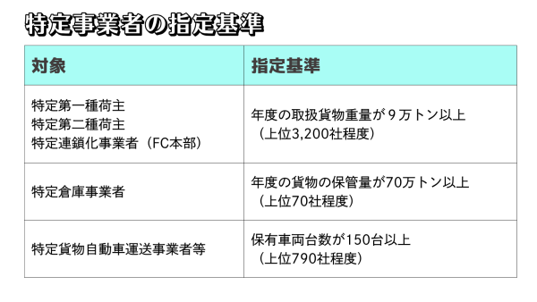 CLO選任の対象は「特定荷主企業」と呼ばれる一定規模以上の事業者。経済産業省・国土交通省による指針では、以下のような基準が想定されてるで。
