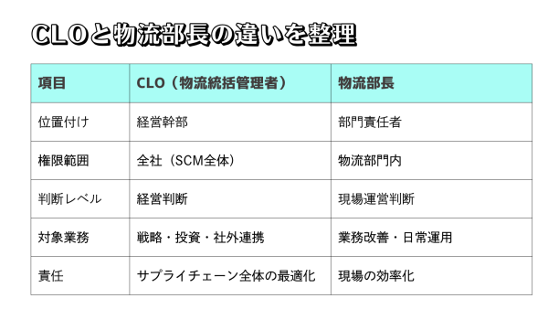 ほな、CLOと物流部長では、一体何がそんなに違うのかについて、それぞれの役割についても整理しとこ。