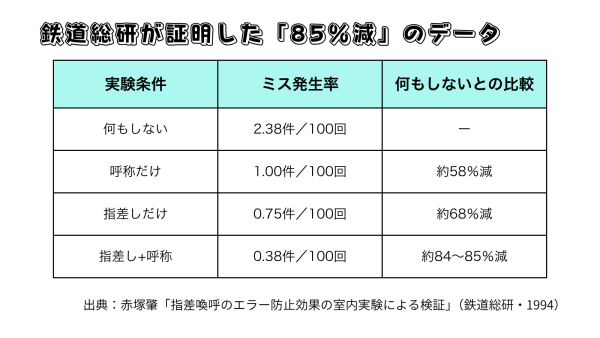 指差呼称は日本独自の安全確認スタイルではあるものの、単なる掛け声ではないねんで。実験でヒューマンエラーが約85%減少し、現場でもインシデントが30〜40%減という実績付きの”科学”といってしまえるもの。