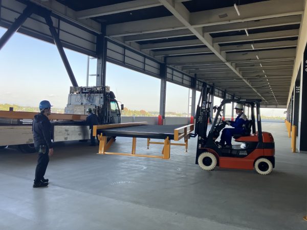 設置はフォークリフト1台で約30分。作業員の方も「思ったより簡単!」と驚かれていました。